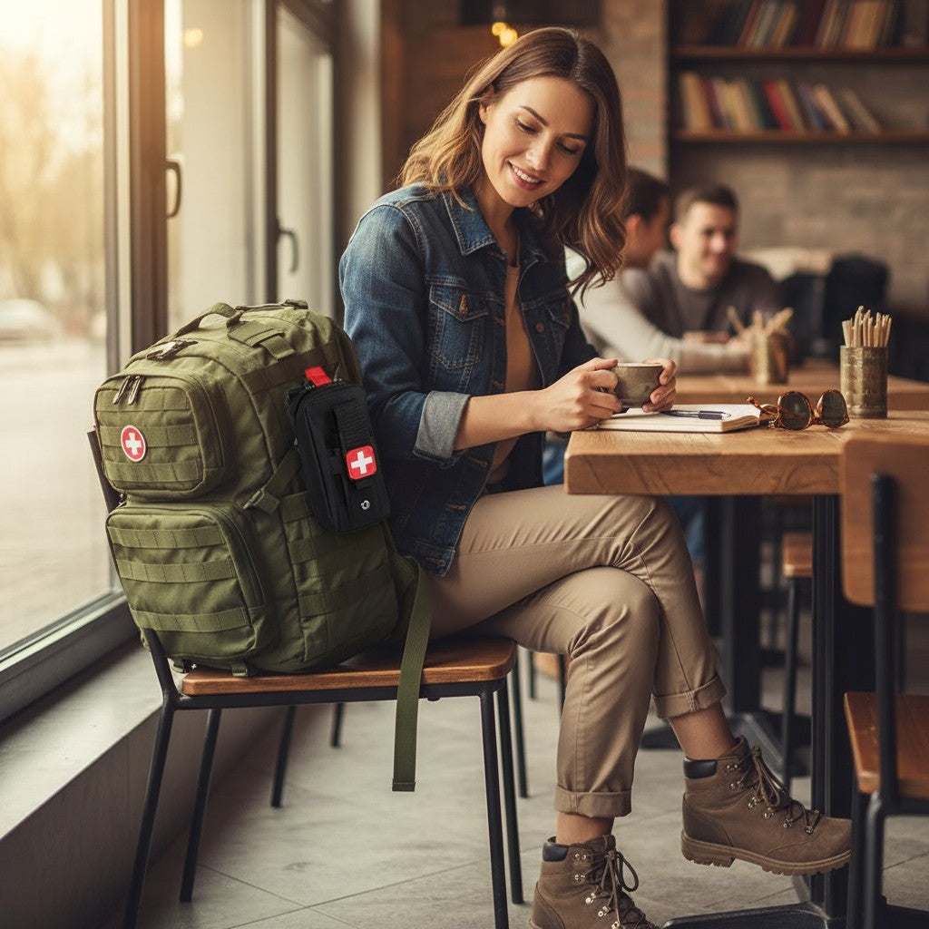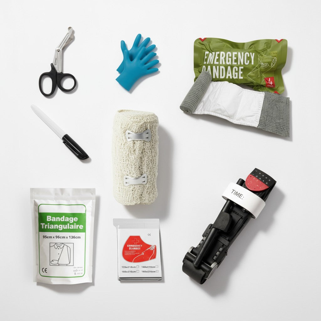Shears, bandages, tourniquet, gloves, emergency blanket, tape, and more.